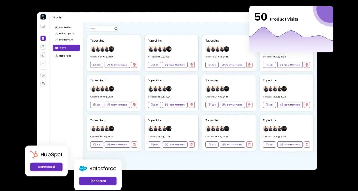 Unlock seamless CRM integrations with Tapect. Effortlessly sync every new connection into your sales funnel with top CRM tools like Salesforce, HubSpot, Microsoft, and Pipedrive. Our platform offers team-ready solutions, enabling you to centralise and track leads collected by your team, with real-time data on lead ownership, locations, and key notes. Experience streamlined connectivity and enhanced lead management with Tapect.